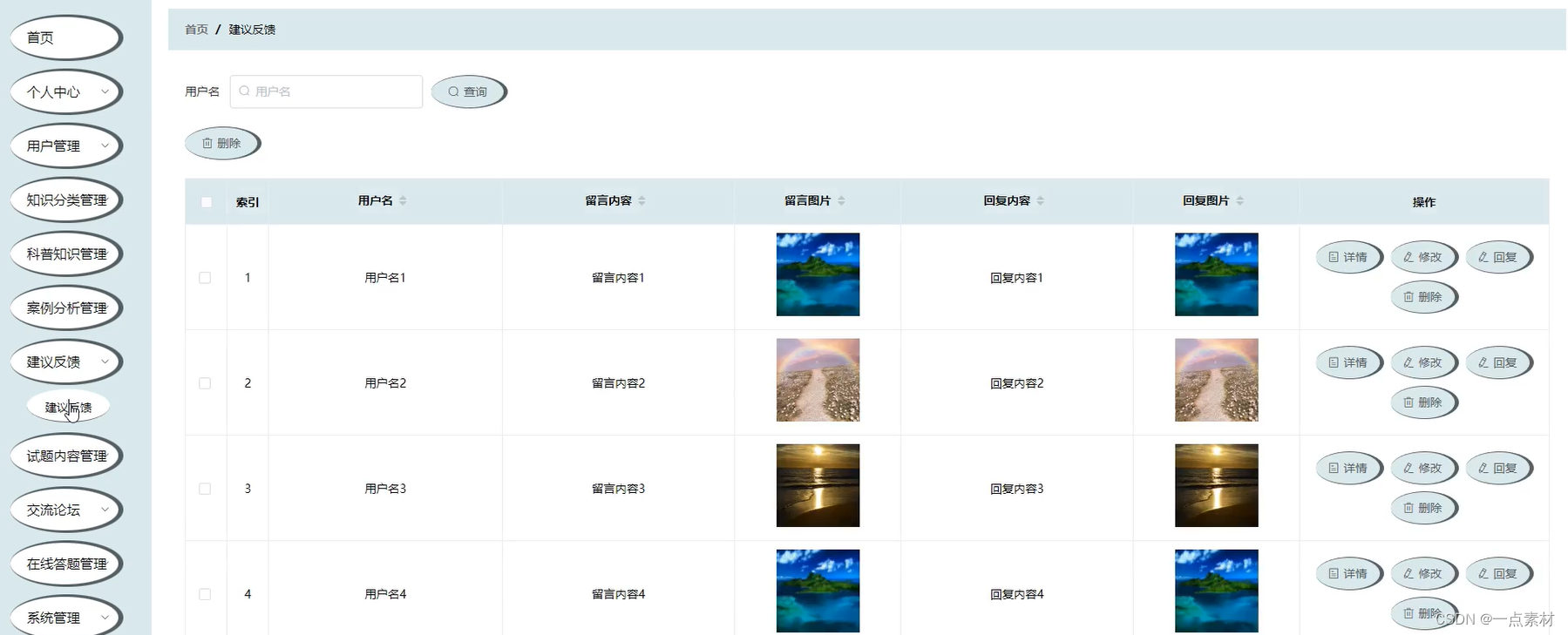 建议反馈管理包括审核用户的留言内容和回复用户留言。建议反馈管理功能的实现界面如下图所示: