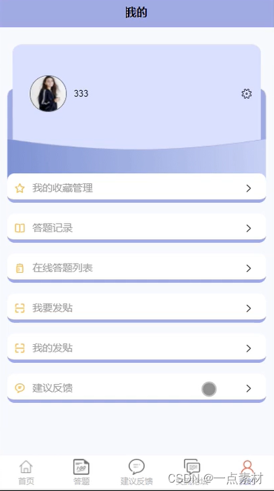 在我的界面里用户可以管理收藏信息、答题信息、帖子信息等。我的功能实现界面如下图所示: