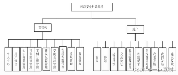 根据系统的功能分析设计出本系统的功能为科普知识管理、用户管理、反馈交流管理、答题管理等。本系统的权限分为用户和管理员两种。界面分为管理员界面和用户界面。本系统的功能结构图如下图所示: