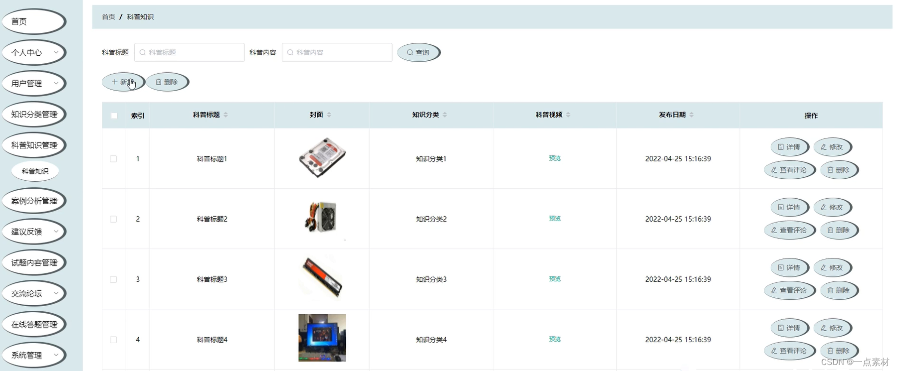 本功能包括对科普知识的添加、删除、修改、查询。添加科普知识时填写科普知识名称、简介等就可以完成,查询科普知识时填写查询条件即可以查询出来相对应的科普知识信息。添加科普知识信息功能的实现界面如下图所示: