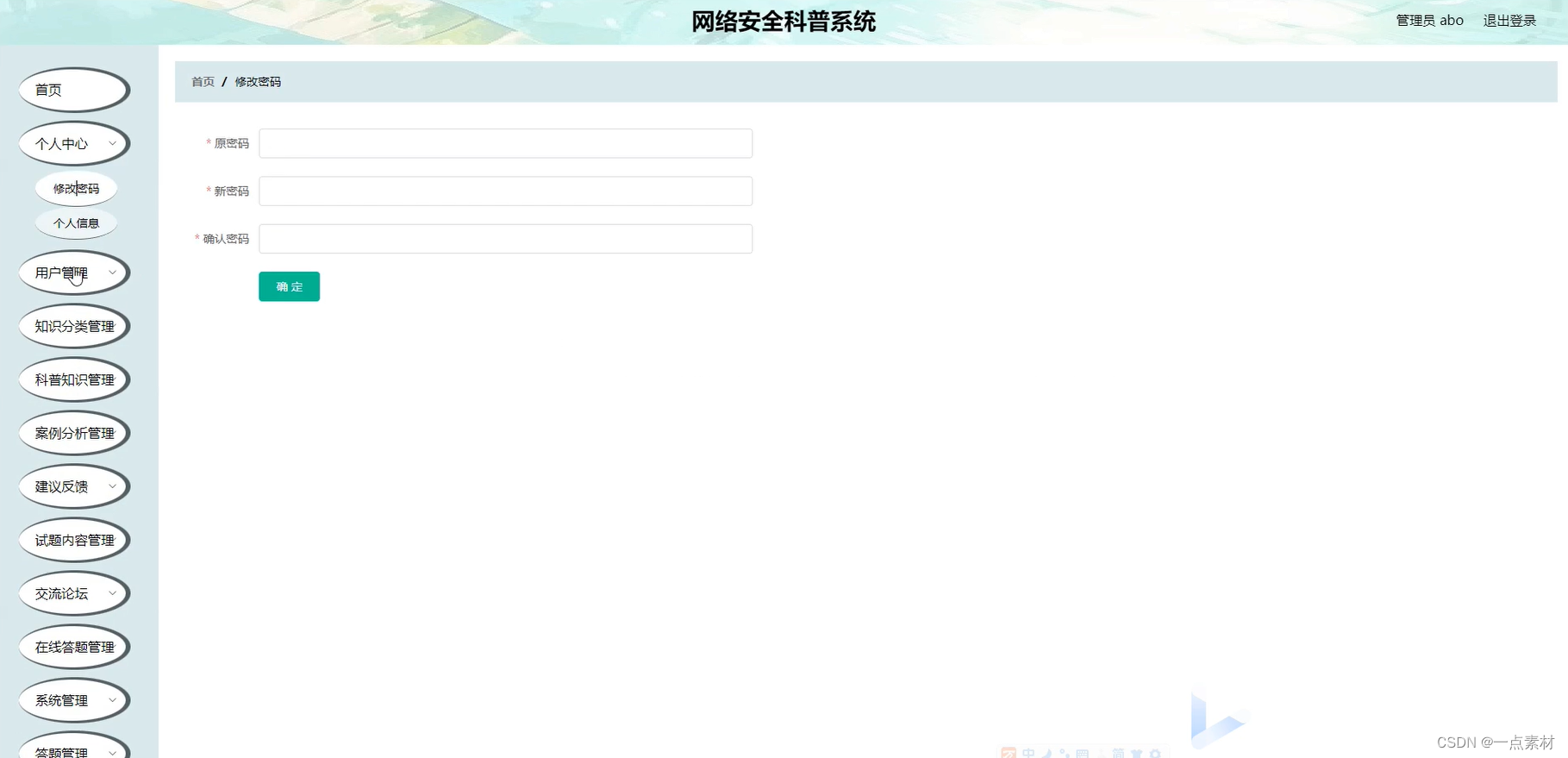 管理员可以对密码、资料进行修改。个人中心功能的实现界面如下图所示: