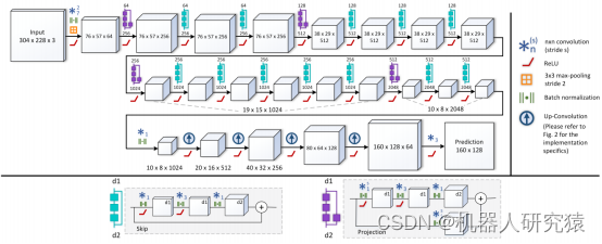 有关传统SLAM部分的模块就不再展开了,这里重点讨论一下CNN深度估计模块和CNN语义分割模块。CNN深度估计模块采用改进版的ResNet网络结构[43],如图10-61所示。该模型的前半部分基于ResNet-50,并用在ImageNet数据集预训练的结果进行权重初始化;而该模型的后半部分则将原来ResNet-50中的池化层和全连接层替换成了升采样层和卷积层,这样就能直接输出深度图。