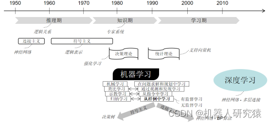 要搞清楚人工智能领域的各种概念为什么常常被混为一谈,这就需要先了解一下其发展历程[12]p10~13,如图10-33所示。从宏观层面来看,人工智能走过了推理期、知识期和学习期。在最开始的推理期发展阶段,人们认为机器只要具有基于逻辑关系的推理能力就可以拥有智能,比如利用一些已知的数学定理经过逻辑推理来证明数学难题。缺乏丰富的知识,仅靠逻辑推理很难奏效,于是研究很快转向知识期发展阶段,也就是想办法让机器拥有更渊博的知识,大量由人工总结出来的知识经验赋予给机器的专家系统在这期间诞生。靠人工来整理知识然后传授给机器太费劲了,要是机器能通过自己学习来获取知识该多好,这就迎来了学习期发展阶段。从方法论层面来看,人工智能分为连接主义和符号主义两个流派。连接主义基于神经网络的连接结构来表示知识,也就是说学习到的知识被隐藏在神经网络的连接结构当中,整个系统相当于一个黑盒子。而符号主义将抽象出来的概念用具体符号表示,学习知识的过程更加透明。当然还有很多无法明确分门别类的研究方法,比如基于决策理论提出的强化学习,再比如以统计理论为基础发展起来的非常著名的支持向量机。由于在人工智能的发展过程中,机器学习这个提法广泛出现于人们的视野,于是慢慢就发展成一个专门的研究领域。所谓机器学习,就是让机器通过学习获取知识,并利用知识解决特定的问题。这里的机器指计算机,而学习指运行在计算机上的程序算法。有人将机器学习具体划分成“在问题求解和规划中学习”、“通过观测和发现学习”、“从指令中学习”、“从样例中学习”等种类;也有人将机器学习划分成“机械学习”、“类比学习”、“示教学习”、“归纳学习”等种类,当然我们也可以根据自己的观点来划分所谓的学习类型,这些划分非常主观,不过从样例中学习应该是应用和研究最多的一个。所谓样例就是供训练的数据,包括有监督学习和无监督学习。回到前面的符号主义,其从样例中学习的典型案例是决策树;而对于连接主义,其从样例中学习的典型案例是神经网络的BP算法实现。如今备受追捧的深度学习,其实本质还是神经网络,只是连接层数增多了。以上所叙述的仅仅是人工智能发展过程中一些有代表性的理论、技术、方法的概念性东西,力争让大家拥有一个更开阔的视野。看完这个发展历程,大家可能会发现自己对人工智能领域的这些个学术概念的理解不但没有变清晰,反而越发模糊了。不用担心,这正是我将其介绍给大家的目的。因为关于智能,目前并没有科学的定义,也没有统一的研究方法。推理、知识、神经网络、机器学习、决策理论等诸多的概念,本身就是在不同的层面不同的时期来讨论的,这些概念之间有些是互相重叠的、有些是发展递进的、有些是特例、有些是不同角度出发的同一观点等等。