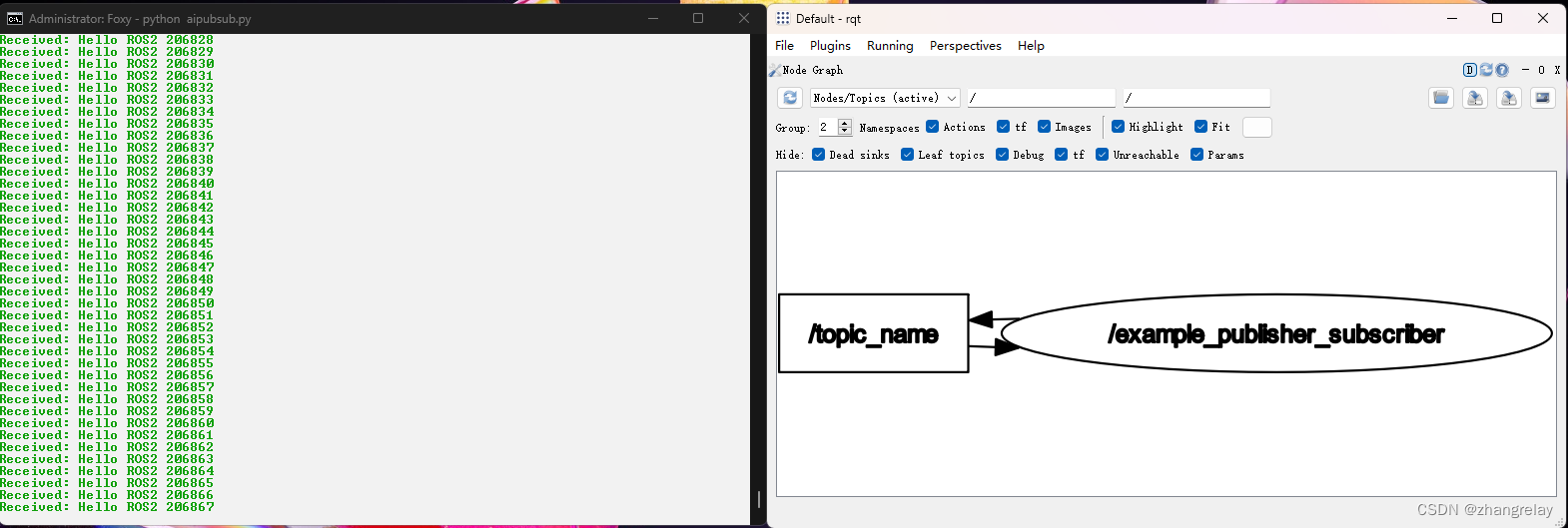 def main(args=None):rclpy.init(args=args)node = rclpy.create_node("example_publisher_subscriber")publisher = node.create_publisher(String, "topic_name", 10)subscriber = node.create_subscription(String, "topic_name", publisher_callback, 10)msg = String()msg.data = "Hello ROS2"i = 0while rclpy.ok():msg.data = "Hello ROS2 " + str(i)i += 1publisher.publish(msg)rclpy.spin_once(node)node.destroy_node()rclpy.shutdown()