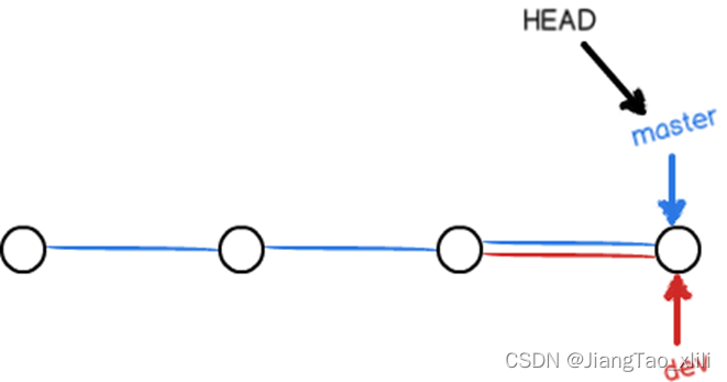 - 当我们创建新的分支如dev时,是Git新建了一个指针叫dev,先指向master相同的提交,再把HEAD指向dev,就表示当前分支在dev上: