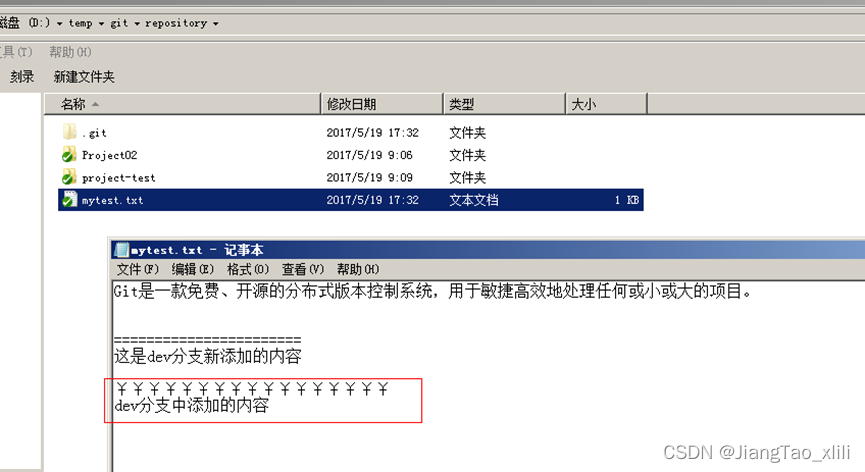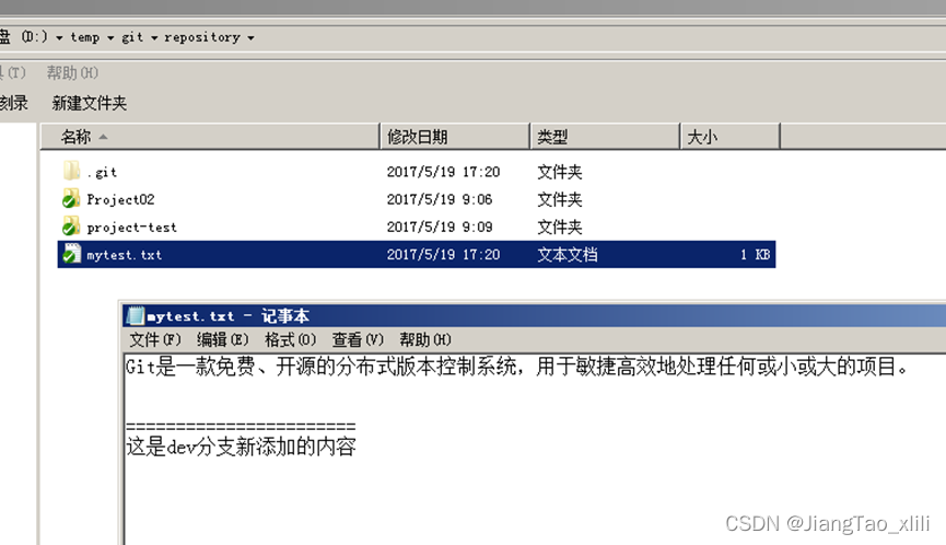 - 分支切换到dev后就可以对工作区的文件进行修改,然后提交到dev分支原理的master分支不受影响。例如我们修改mytest.txt中的内容,然后提交到dev分支。