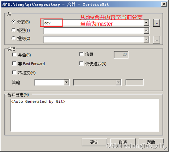 - 将dev分支的内容合并到master分支,当前分支为master。从右键菜单中选择“合并”: