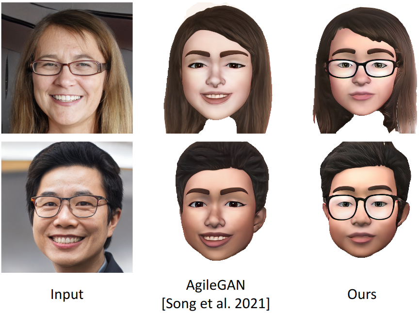 另一方面,为了保留照片里人物的眼镜等样貌特征,作者提出使用携带语义信息的 W+ 空间,相比于 AgileGAN 的 Z 空间,能更好的保留这些语义特征。