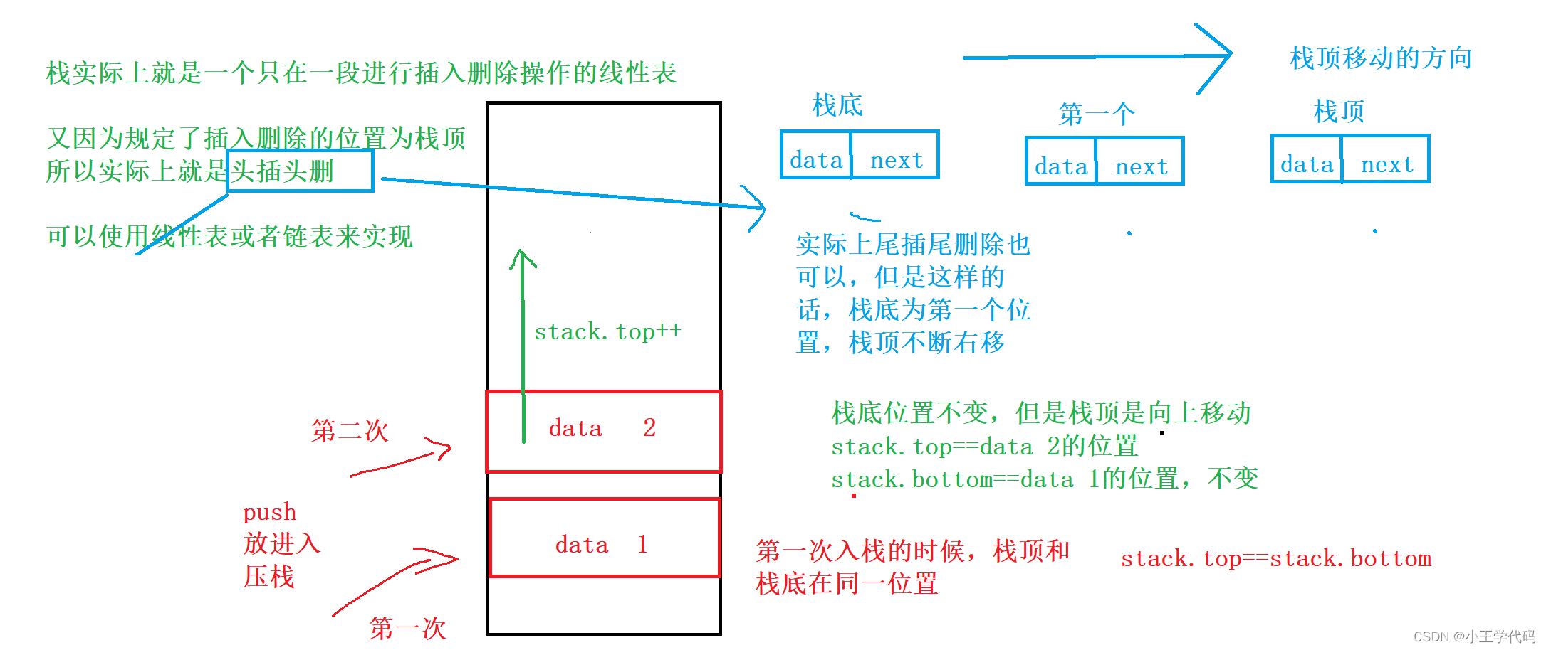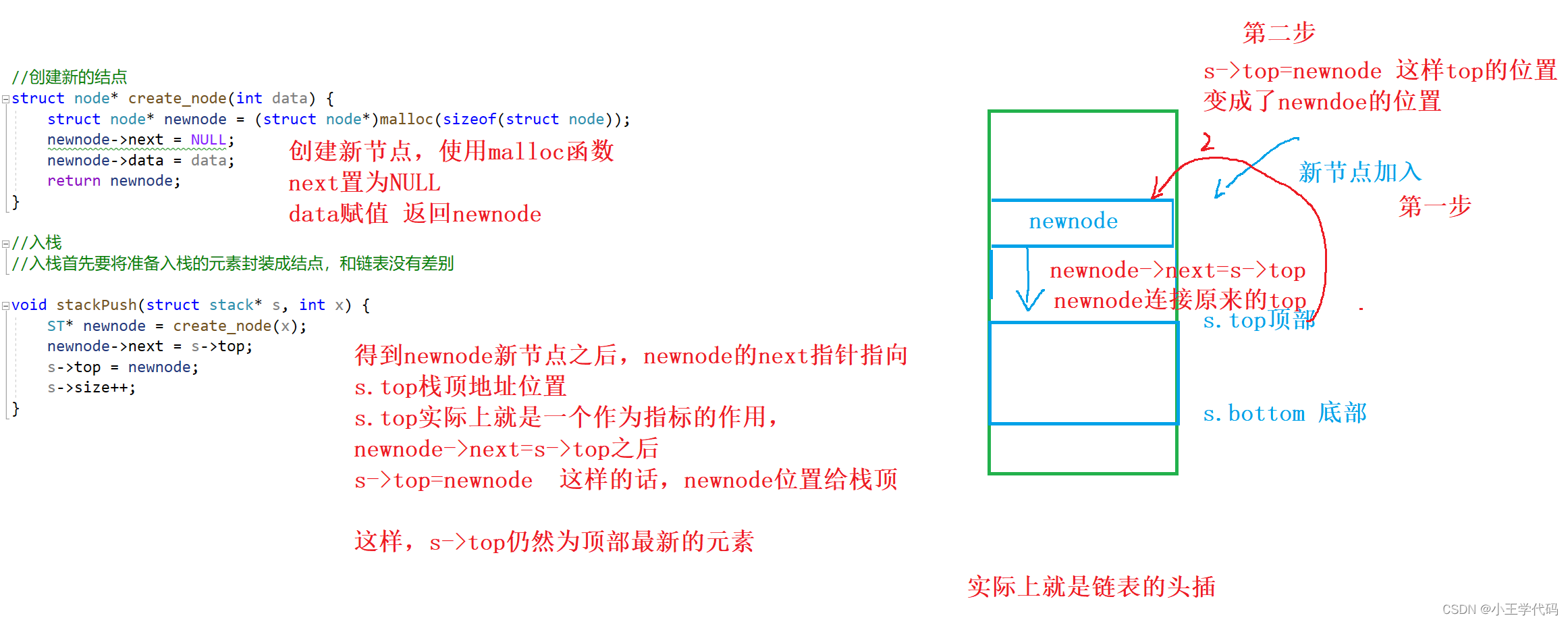 node中的next指针用于让栈中上面的节点连接到下面的节点,stack中的top和bottom分别存放当前栈顶元素的地址和栈底元素的后一个位置的地址(NULL),