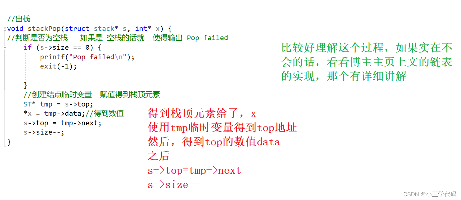 //判断是否为空栈 如果是 空栈的话就 使得输出 Pop failedif (s->size == 0) {printf("Pop failed\n");exit(-1);}//创建结点临时变量 赋值得到栈顶元素ST* tmp = s->top;*x = tmp->data;//得到数值s->top = tmp->next;s->size--;
