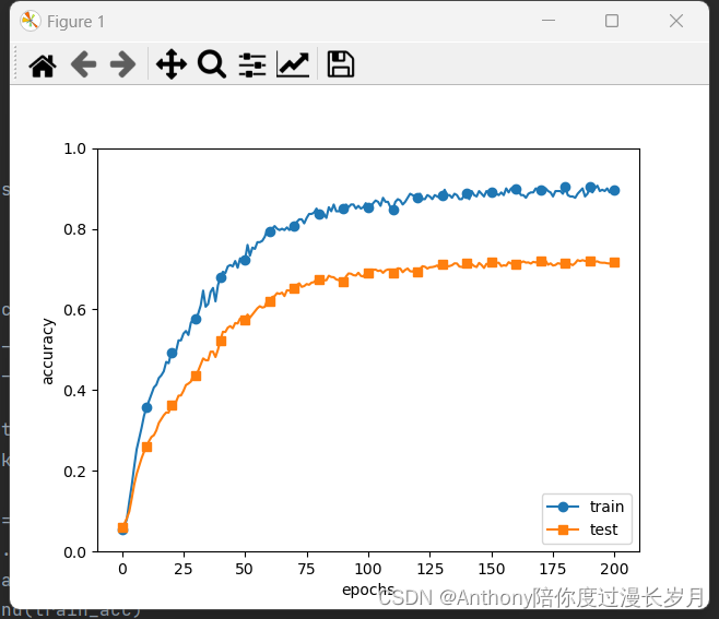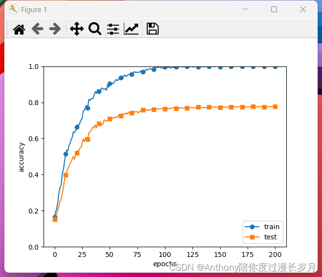 epoch_cnt = 0for i in range(1000000000):batch_mask = np.random.choice(train_size, batch_size) # mini_batch 处理x_batch = x_train[batch_mask]t_batch = t_train[batch_mask]grads = network.gradient(x_batch, t_batch)optimizer.update(network.params, grads) # 更新参数 神经网络的学习if i % iter_per_epoch == 0:train_acc = network.accuracy(x_train, t_train) # 计算识别精度test_acc = network.accuracy(x_test, t_test)train_acc_list.append(train_acc)test_acc_list.append(test_acc)print("epoch:" + str(epoch_cnt) + ", train acc:" + str(train_acc) + ", test acc:" + str(test_acc))epoch_cnt += 1if epoch_cnt >= max_epochs:break# 3.绘制图形==========