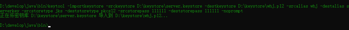 keytool -importkeystore -srckeystore D:\keystore\server.keystore -destkeystore D:\keystore\whj.p12 -srcalias whj -destalias serverkey -srcstoretype jks -deststoretype pkcs12 -srcstorepass 111111 -deststorepass 111111 -noprompt