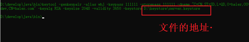 keytool -genkeypair -alias whj -keypass 111111 -storepass 111111 -dname “C=CN,ST=SD,L=QD,O=haier,OU=dev,CN=haier.com” -keyalg RSA -keysize 2048 -validity 3650 -keystore D:\keystore\server.keystore