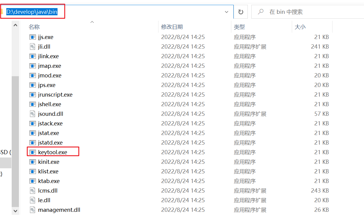 2. 打开keytool所在的bin目录,然后在上面的路径显示框中输入CMD,然后回车,即可在当前文件夹下打开命令提示符,并且路径是当前文件夹。