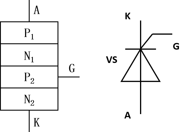 单向晶闸管有阳极(A),阴极(K)和控制极(G)三个极,由4层半导体(P1,N1,P2,N2)三个PN结构成。由最外层的P层和N层分别引出阳极(A)和阴极(K);由中间的P层引出控制极(G)。如图所示: