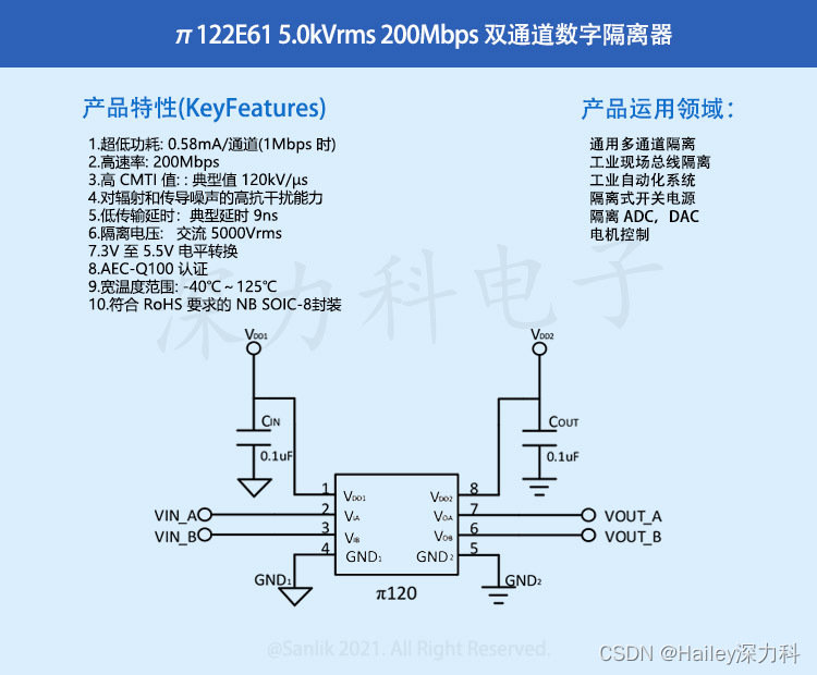 2Pai半导体-推出π122E61双通道数字隔离器 智能分压技术 兼容代替Si8622ET-IS 电路简单、稳定性更高 ,具有出色的性能特征和可靠性,整体性能优于光耦和基于其他原理的数字隔离器产品。 产品传输通道间彼此独立,可实现多种传输方向的配置,可实现 5.0kVrms 隔离耐压等级和 DC 到 200Mbps 信号传输。该系列产品支持 3.0V 到5.5V 的工作电压,并支持 3.0V 到 5.5V 信号电平转换。当输入电源不供电或无输入信号,输出电源供电正常的情况下,隔离器输出默认电平。