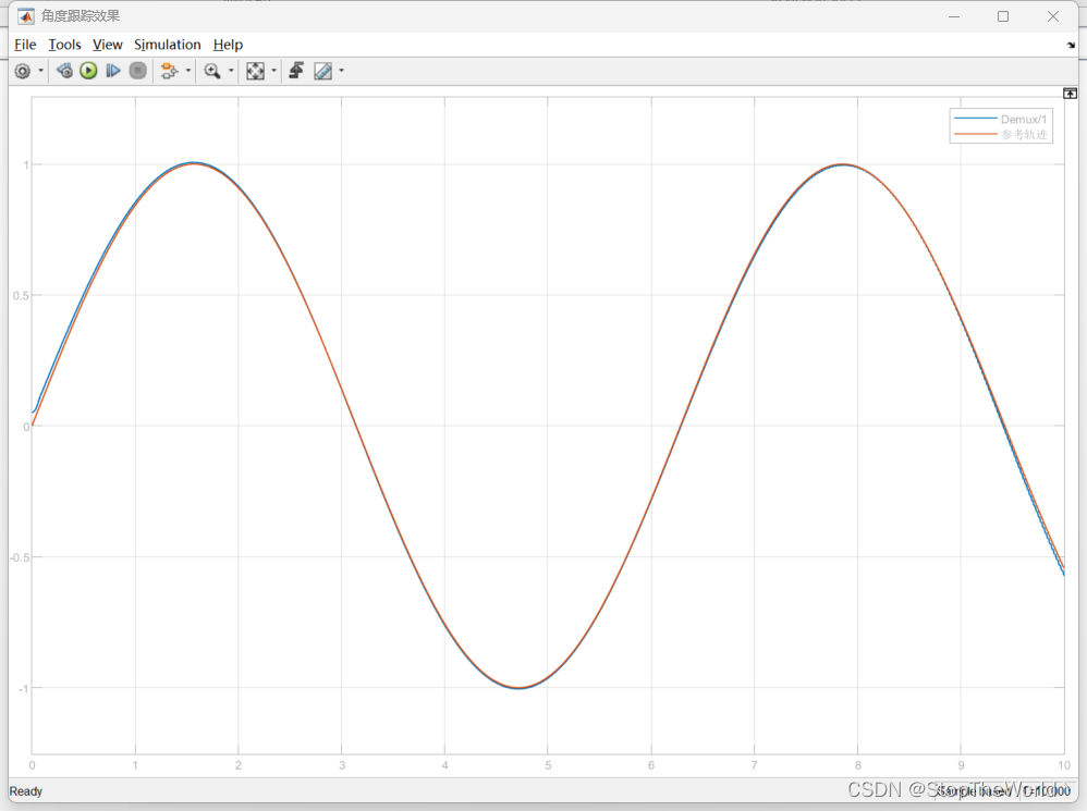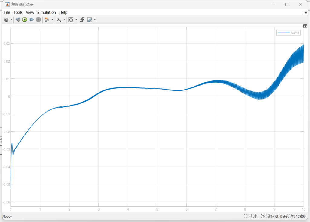 根据仿真结果可得,角度跟踪效果良好,角度跟踪误差在1e-2数量级,较好的完成轨迹跟踪的目的,因此可得,模糊神经网络控制器设计成功。