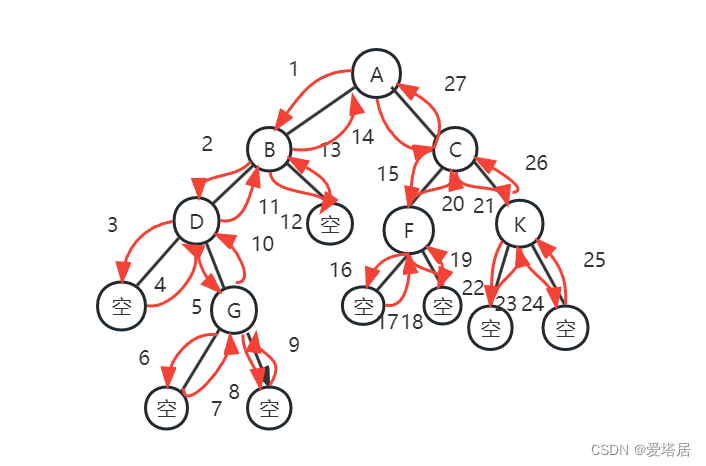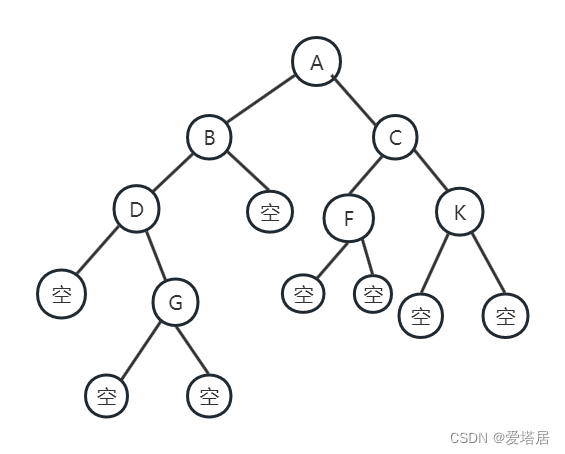 再遍历A的右子树C,打印C,遍历C的左子树F,打印F,再遍历F的左右子树为空,返回F,返回C,再遍历C的右子树K,打印K,遍历K的左右子树为空,返回K,返回C,返回A。
