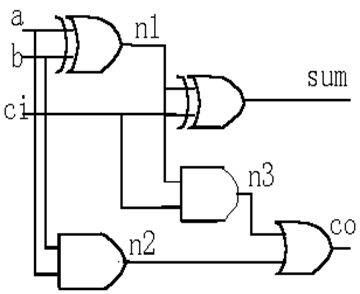 wire a, b, ci, sum, co, n1, n2, n3; xor u0(n1, a, b), u1(sum, n1, ci); and u2(n2, a, b), u3(n3, n1, ci); or (co, n2, n3); endmodule