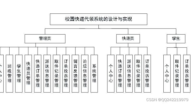 本校园快递代领系统主要包括三大功能模块,即学生功能模块、快递员功能模块和管理员功能模块。