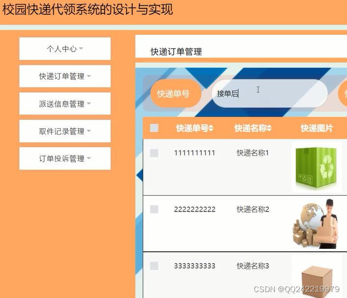 (1)管理员模块:系统中的核心用户是管理员,管理员登录后,通过管理员功能来管理后台系统。主要功能有:个人中心、班级管理、学生管理、快递员管理、快递订单管理、派送信息管理、取件记录管理、订单投诉管理、留言反馈、论坛信息、系统管理等功能。