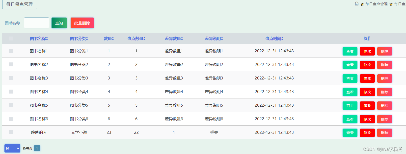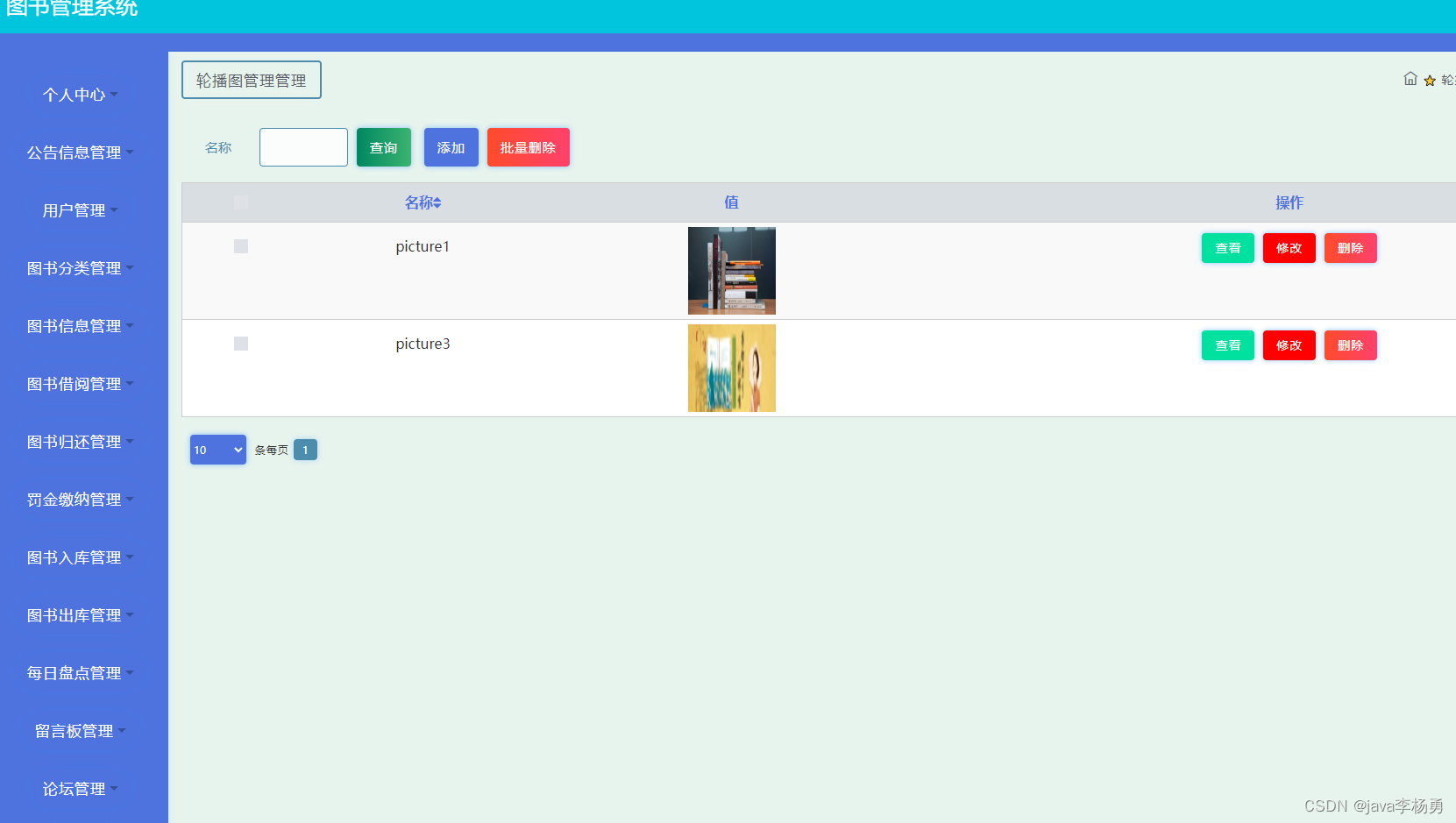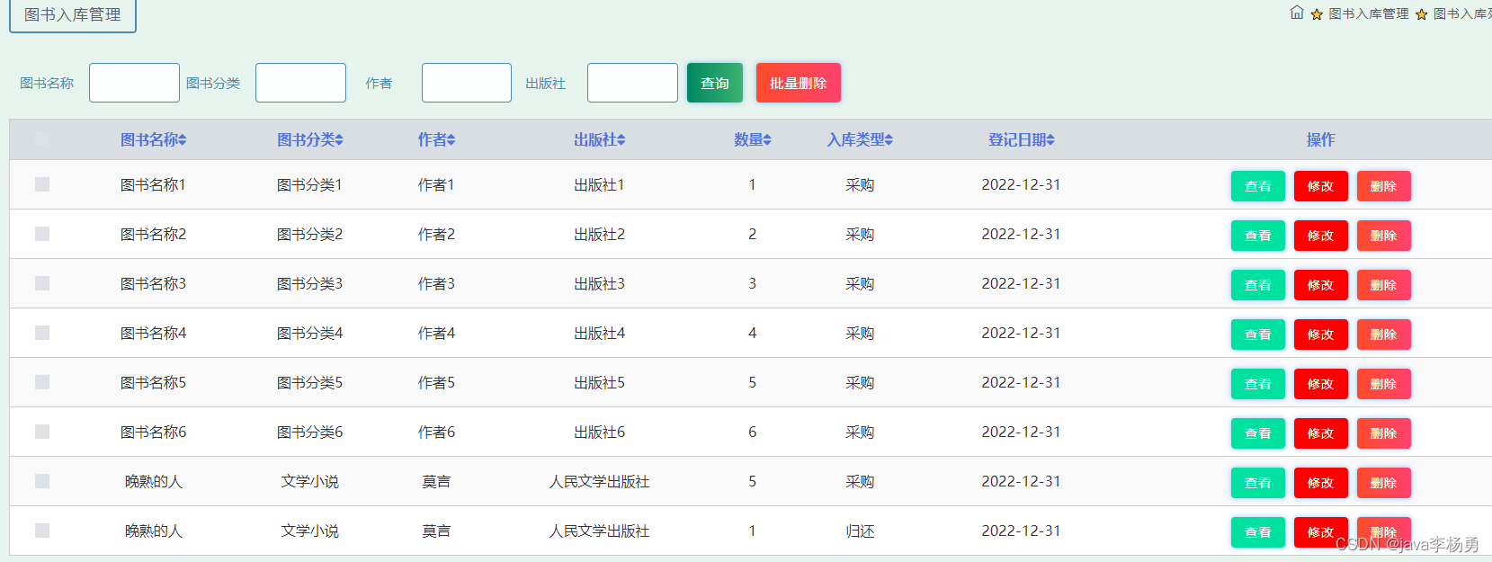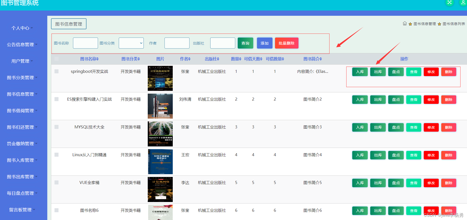 在图书信息管页面中可以查看图书名称、图书分类、图片、作者、出版社、数量、可借天数、可借数量、图书简介等信息进行入库、出库、操作盘点,并可根据需要对已有图书信息进行修改或删除等详细操作