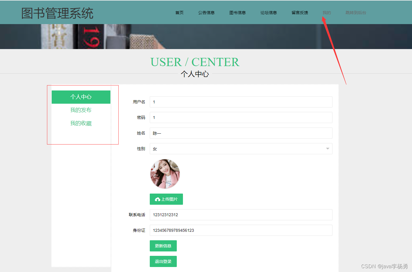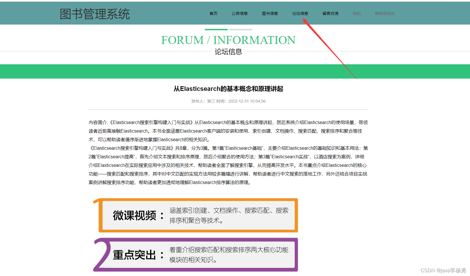 在系统首页可以查看首页、公告信息、图书信息、论坛信息、留言反馈、我的、跳转到后台等内容