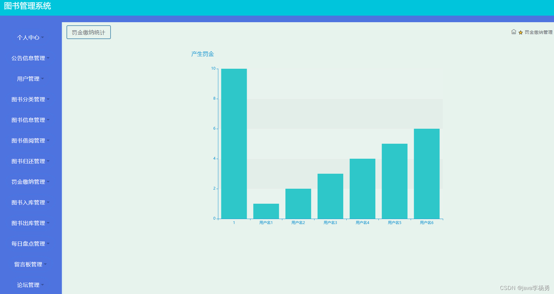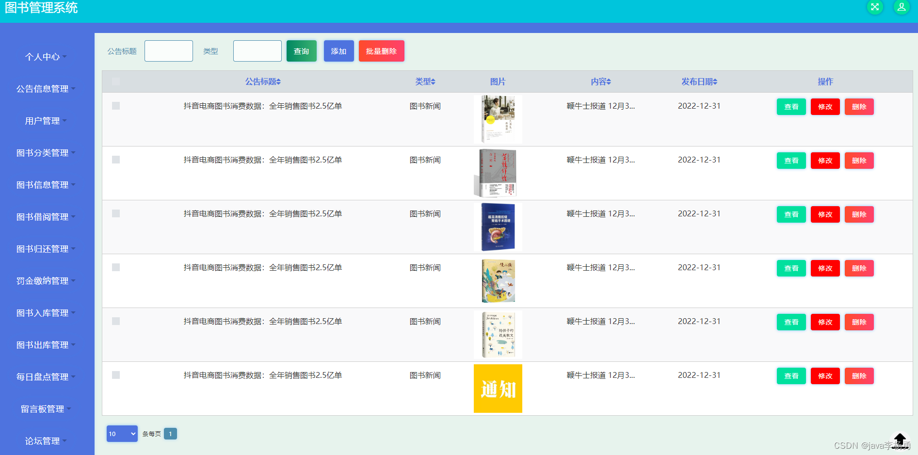 管理员登录进入图书借阅系统可以查看首页:个人中心、公告信息管理、用户管理、图书分类管理、图书信息管理、图书借阅管理、图书归还管理、罚金缴纳管理、图书入库管理、图书出库管理、每日盘点管理、留言板管理、论坛管理等信息