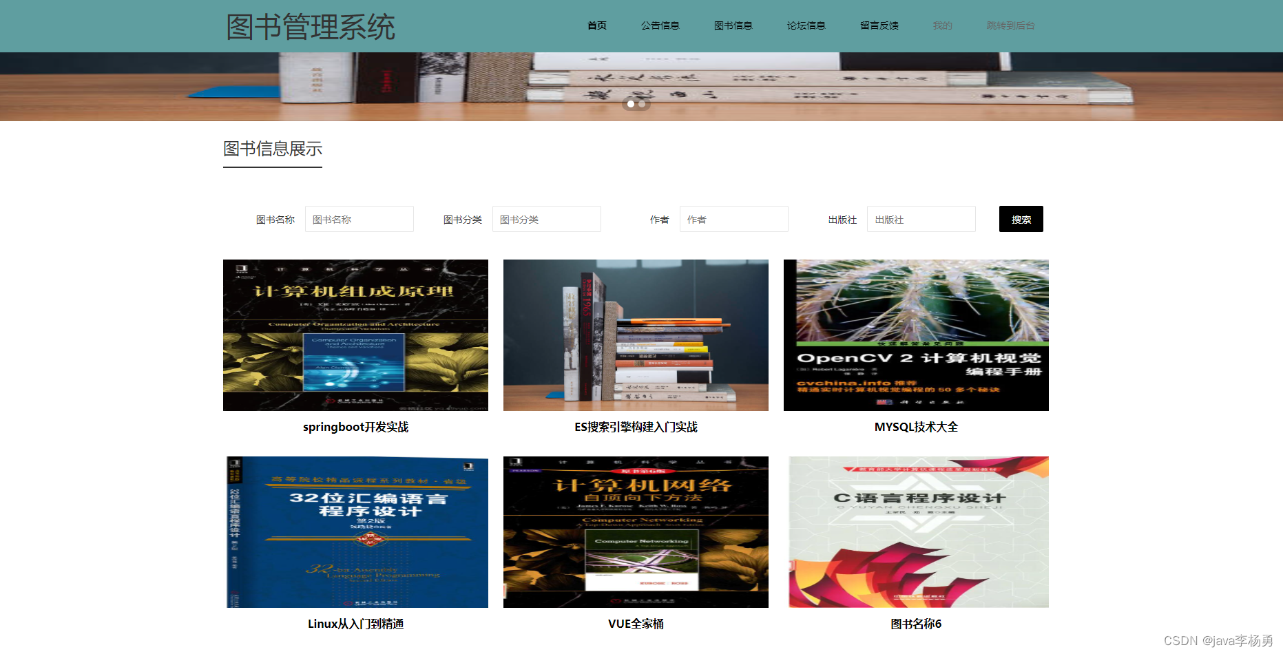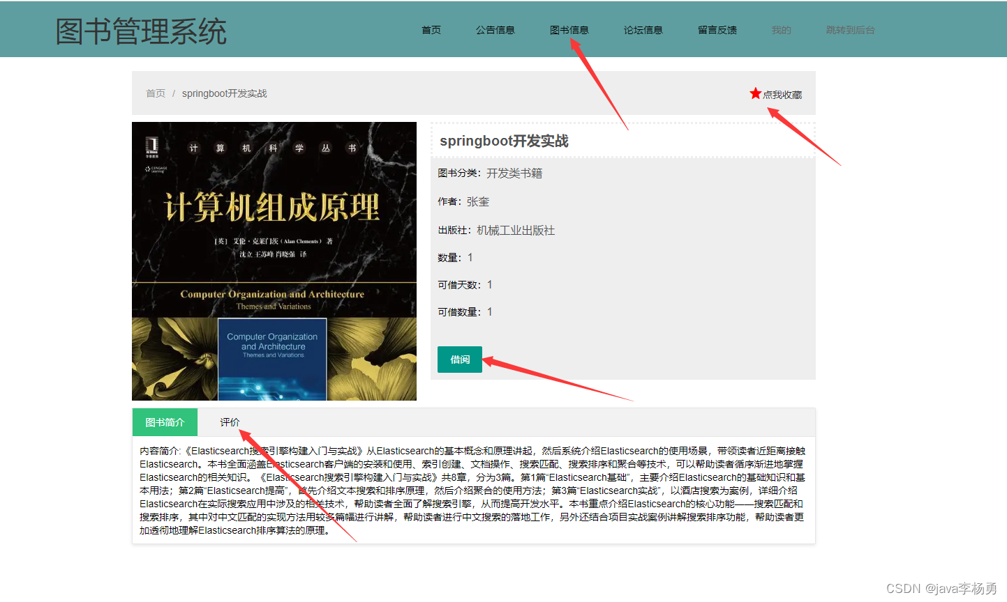 图书信息,用户在图书信息页面可进行查看、收藏、评论操作