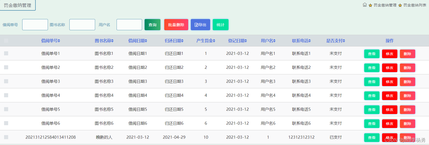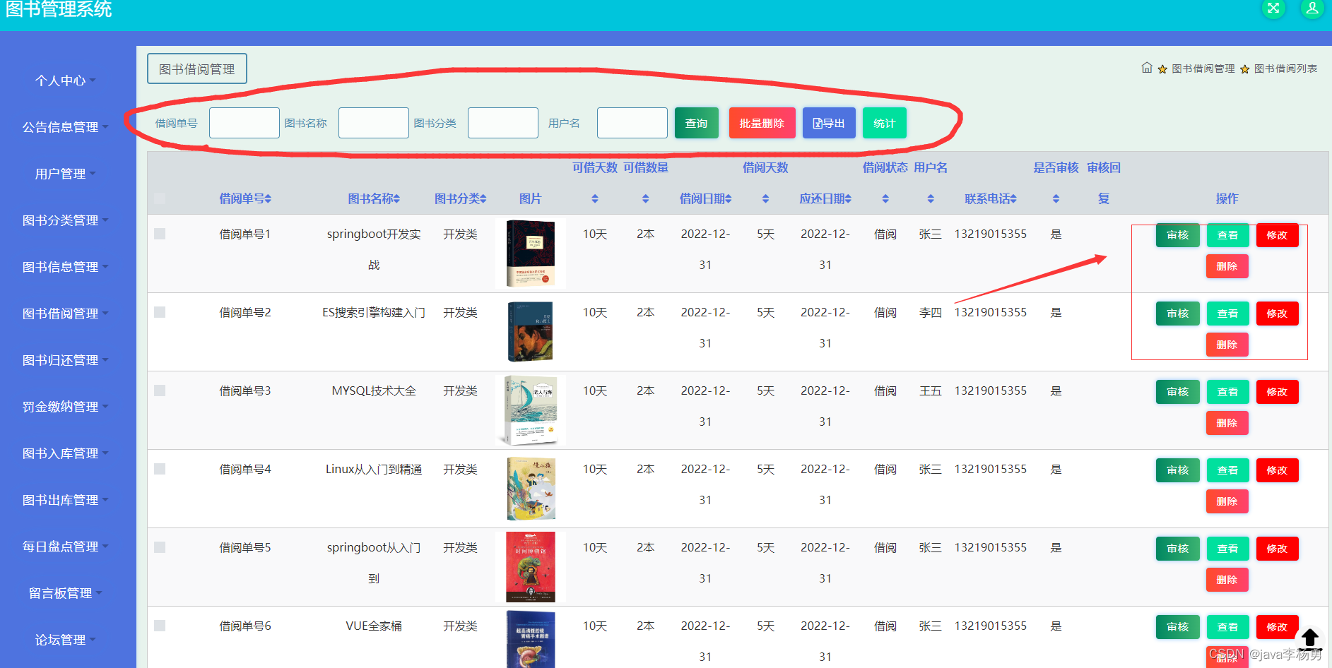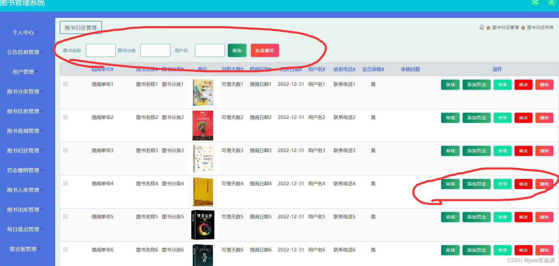 用户在图书借阅管理进行归还、查看、修改、删除操作