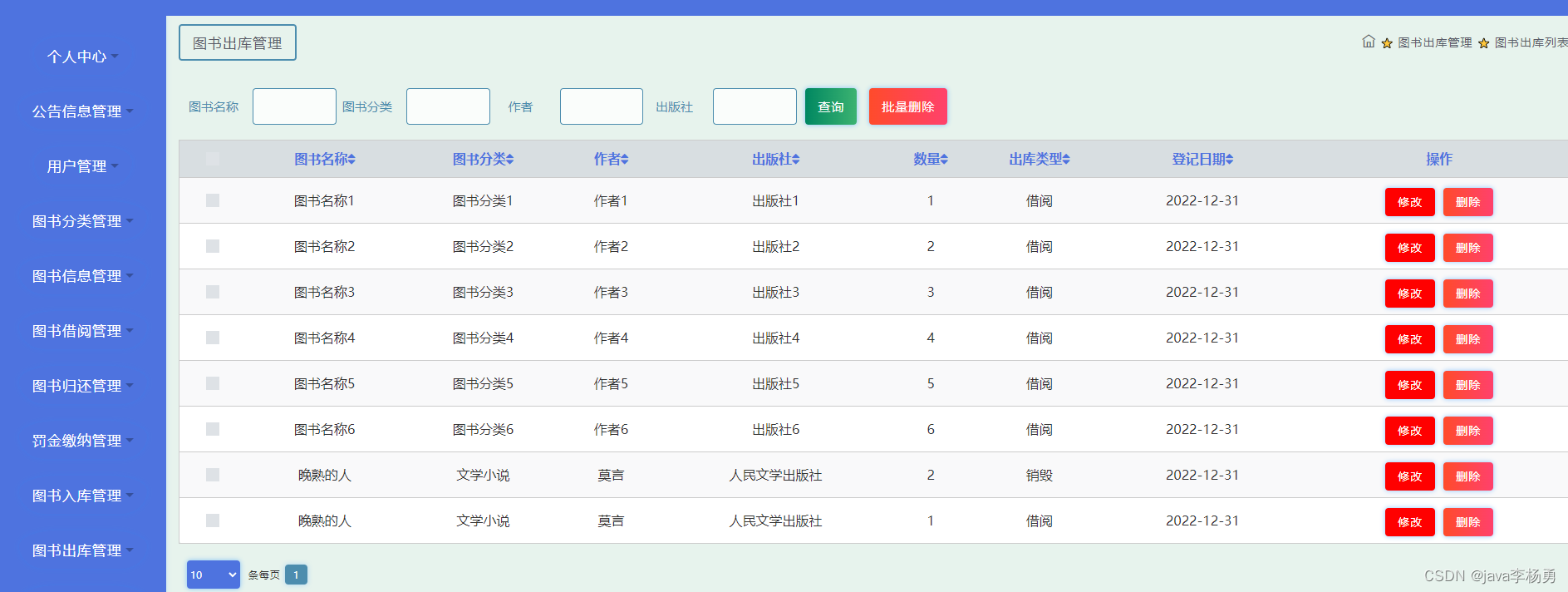 管理员在图书出库信息可以进行添加,修改或删除等详细操作