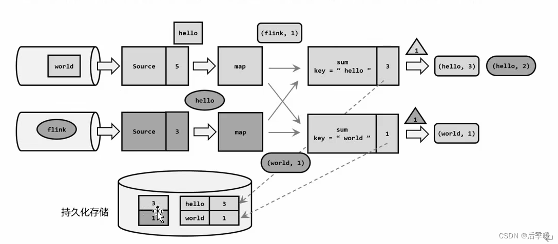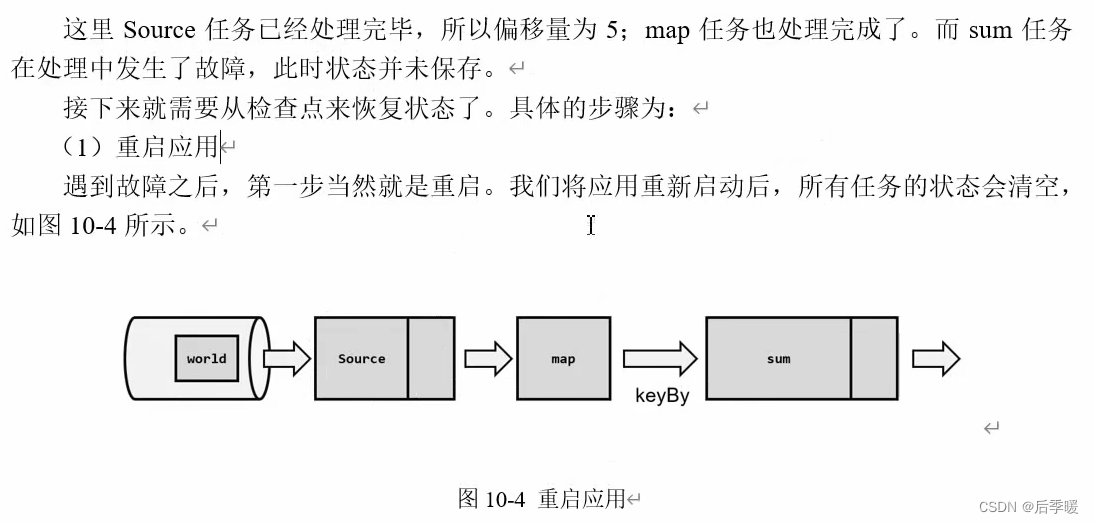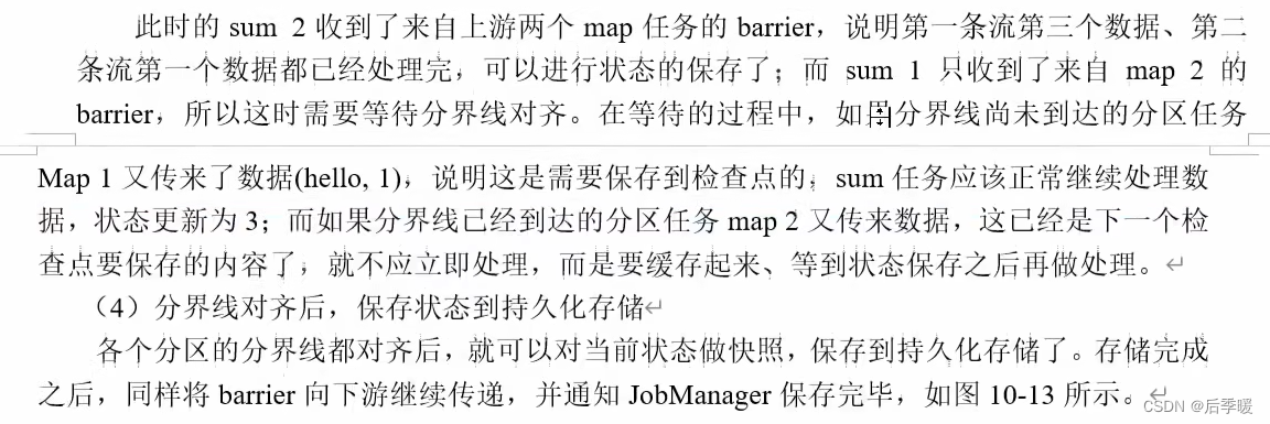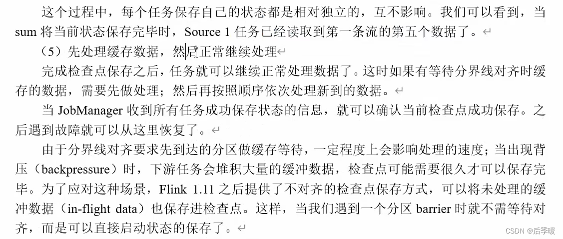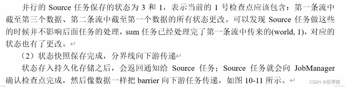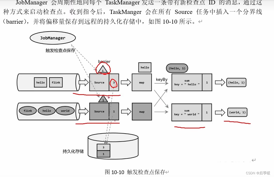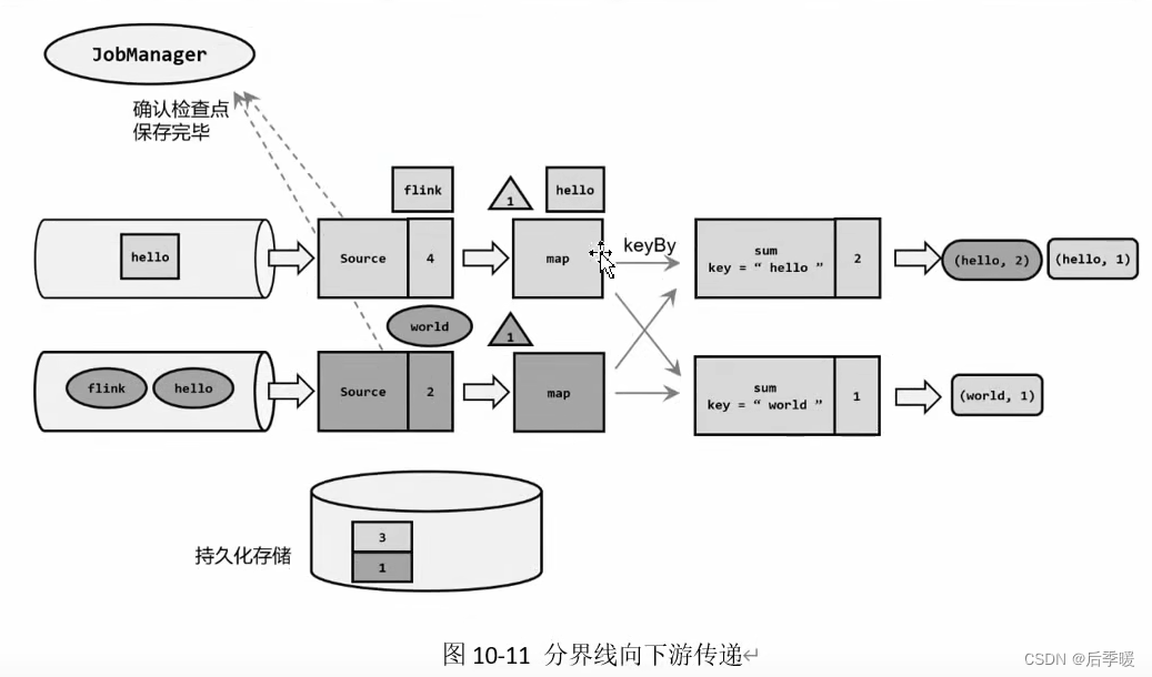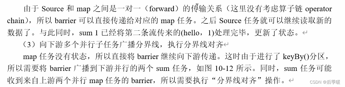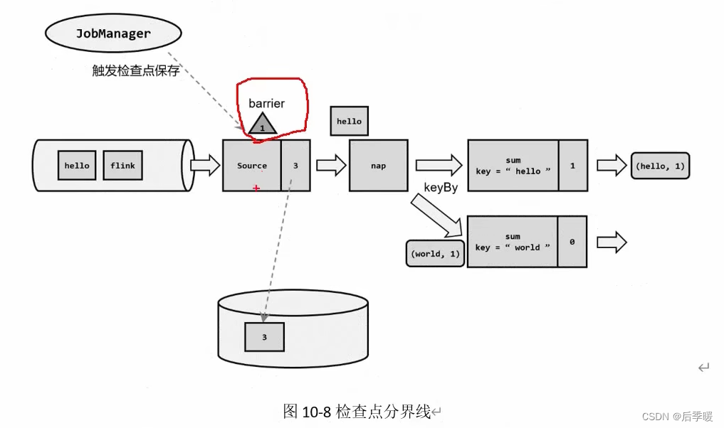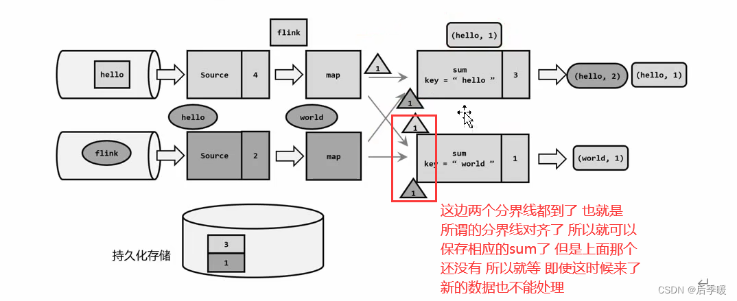 说白了就是等你要处理的这个或这波数据被所有任务(执行完所有算子)处理完了 再做检查点保存(下图就是三个数据都被map、sum处理完 就做检查点保存 source是读取数据的)