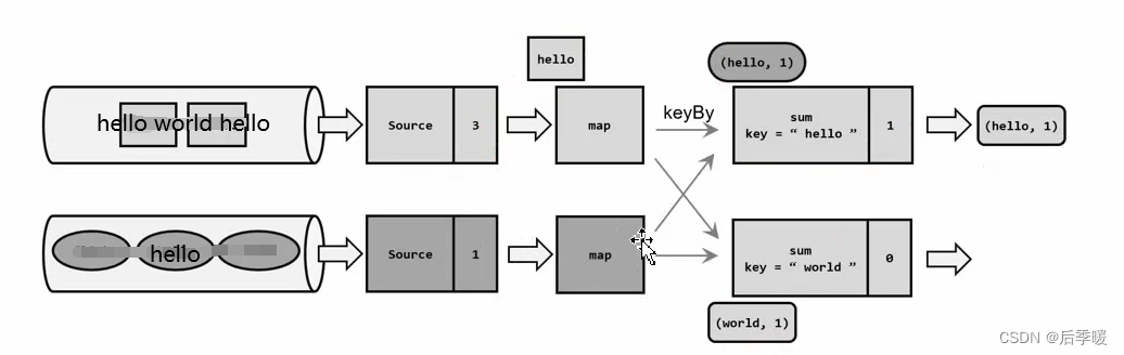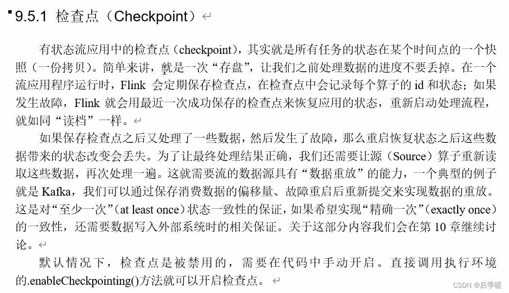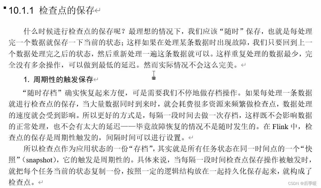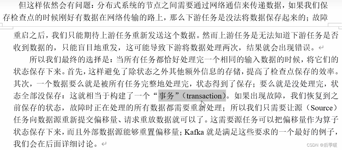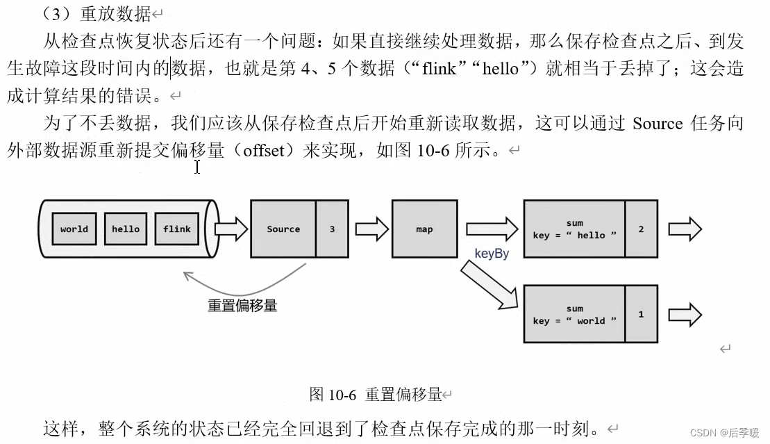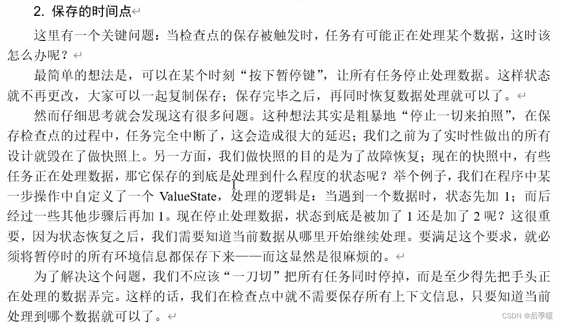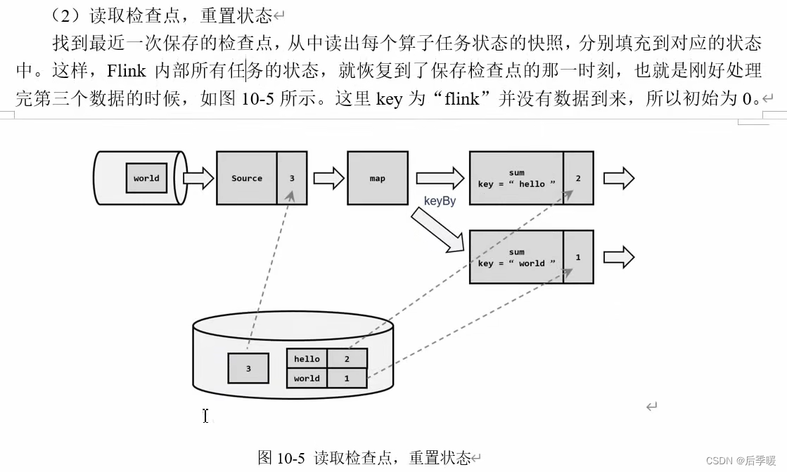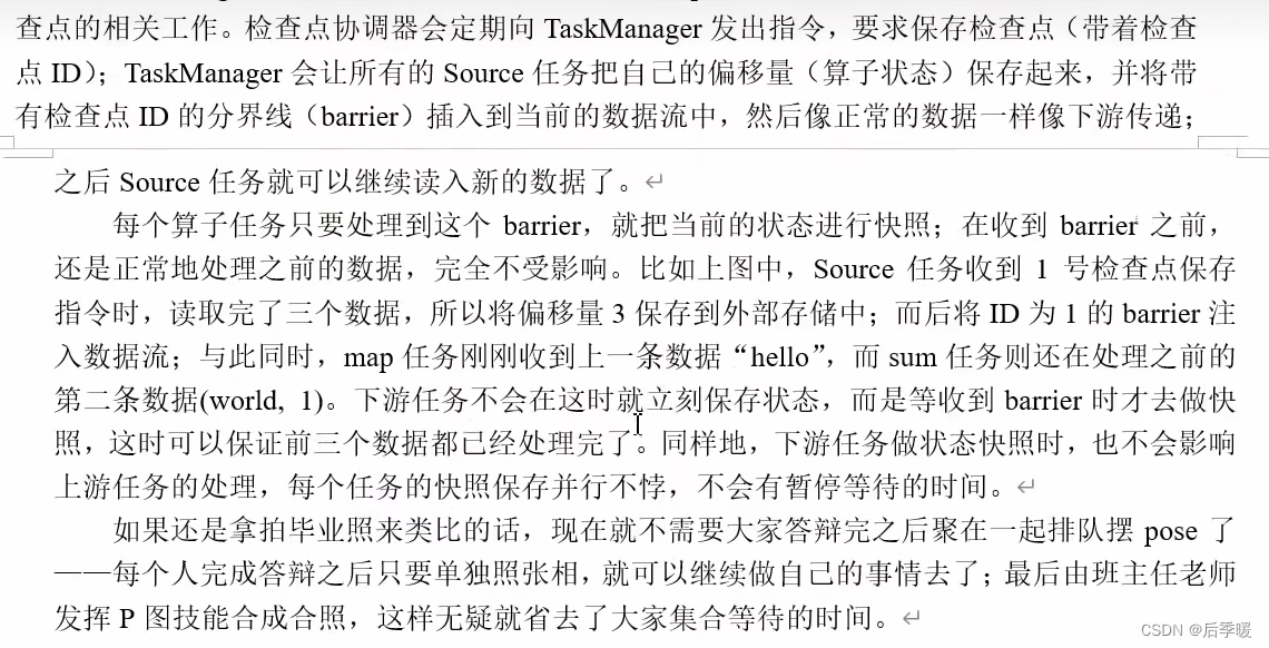 就比如几个小水杯(一个小水杯代表一个数据)往大水杯里倒水(就是保存状态)小水杯灌满,意味着这个数据被所有任务(也就是所有算子)处理完 才能往大水杯里倒水 所以当你小水杯灌水的时候 挂了 不影响大水杯 你小水杯都清空 回到大水杯上次保存的内容(上次检查点的时候)