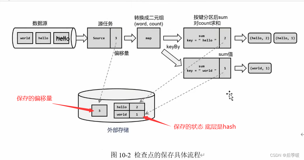 下图只是一个检查点的保存过程(拆解)这一个检查点最终保存了三个数据的偏移量和状态