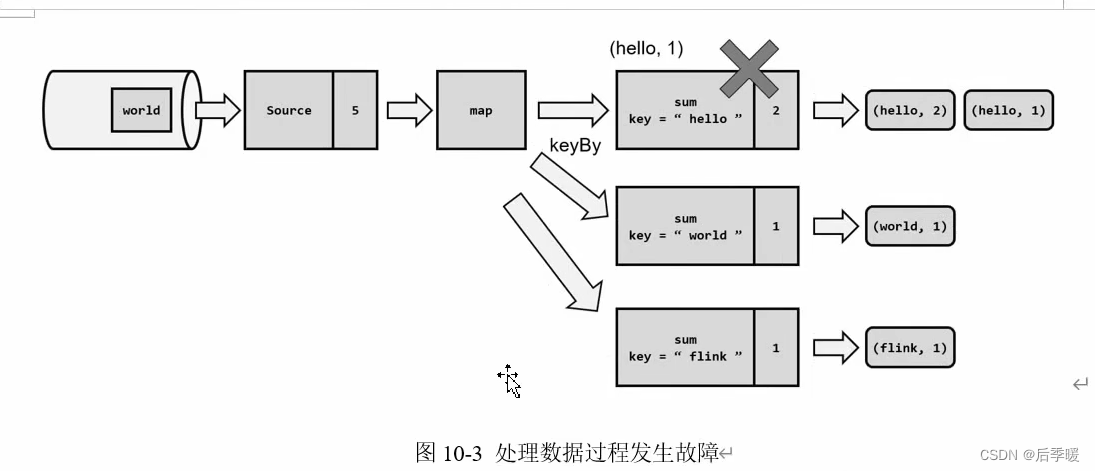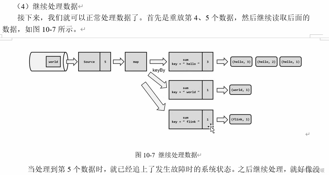 处理完前三个数据以后 做了一次检查点的保存 然后第四个第五个单词是flink和hello flink处理完 处理hello的时候挂了 如下图