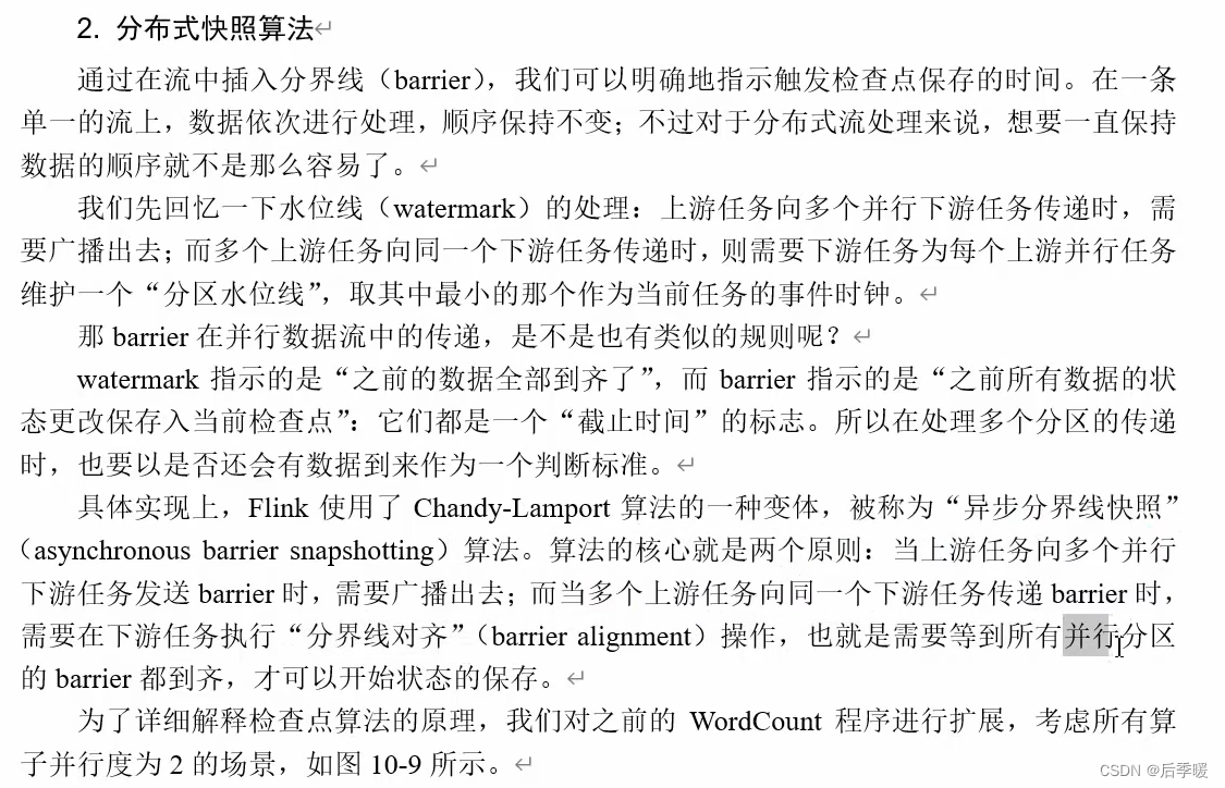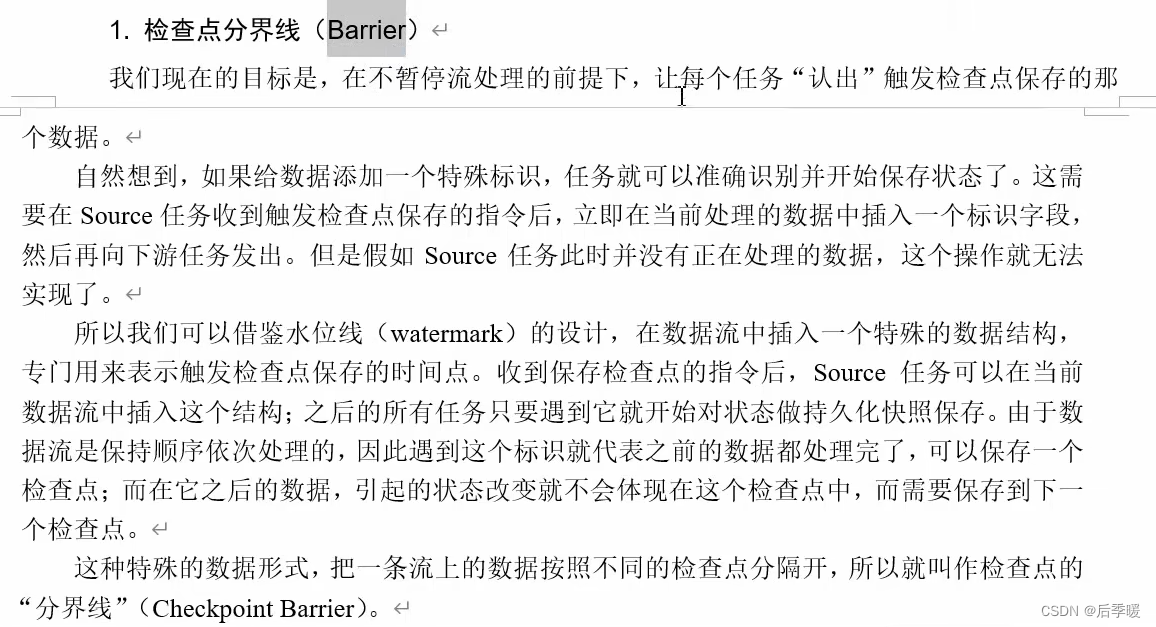 这里的意思是 你在source端处理数据时处理到barrier 然后把这个barrier注入数据流 barrier就在那个触发检查点的数据旁边 你后面来的数据什么的正常来 但是前面的数据都处理完了 并且伴有barrier