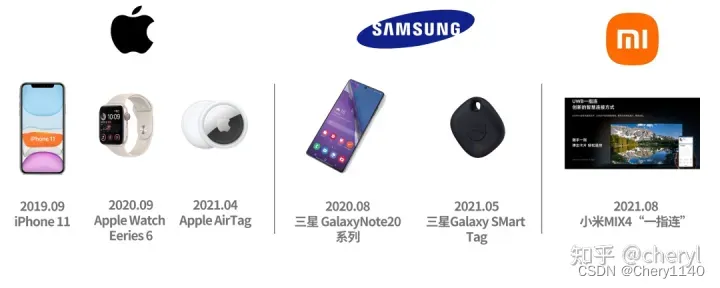 (2)手机厂商从2019年开始相继推出搭载 UWB技术的机型:最先应用UWB的是2019 年苹果发布的iPhone11,加装UWB主要是为了增强空间感知能力,比如在隔空投送时会识别投送设备的距离,越近越优先;2020年三星Note20系列也开始搭载UWB,主要用于“对准分享”功能;2021年小米发布IMX4时展示的“一指连”功能,主要就是靠UWB技术实现。