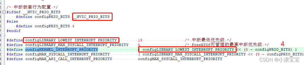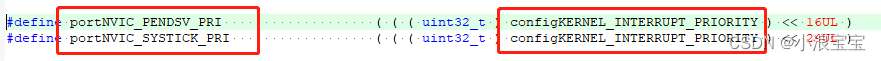 configKERNEL_INTERRUPT_PRIORITY为变量configLIBRARY_LOWEST_INTERRUPT_PRIORITY左移8-configPRIO_BITS位(其中configPRIO_BITS宏定义为4,configLIBRARY_LOWEST_INTERRUPT_PRIORITY宏定义为15),即将15左移4位,STM32优先级配置低4位并没有用到,左移4位到高四位。