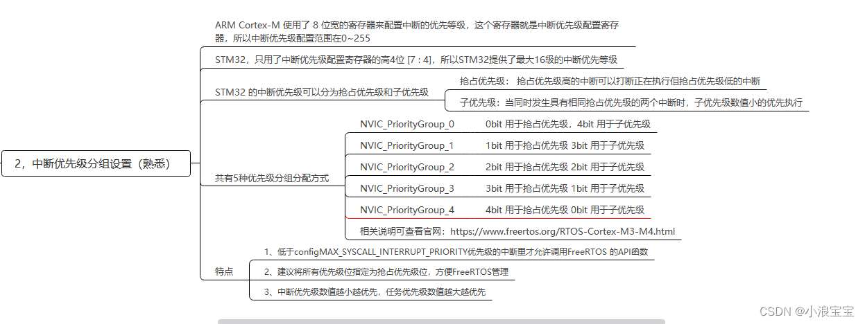 一共有 5 种分配方式,对应着中断优先级分组的 5 个组,FreeRTOS为了方便管理使用的是优先级分组4,全部用于抢占优先级。