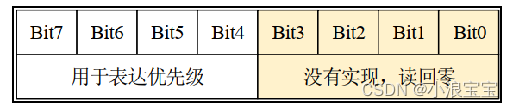 ARM Cortex-M 使用了 8 位宽的寄存器来配置中断的优先等级(最大,256个优先级,0~255),这个寄存器就是中断优先级配置寄存器。但STM32,只用了中断优先级配置寄存器的高4位 [7 : 4],所以STM32提供了最大16级的中断优先等级。
