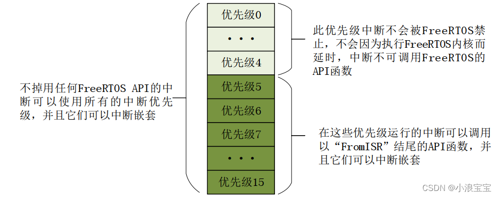 1、低于configMAX_SYSCALL_INTERRUPT_PRIORITY优先级的中断里才允许调用FreeRTOS 的API函数(在代码中configMAX_SYSCALL_INTERRUPT_PRIORITY设置的是5,所以能被FreeRTOS操作的中断优先级是5~15)
