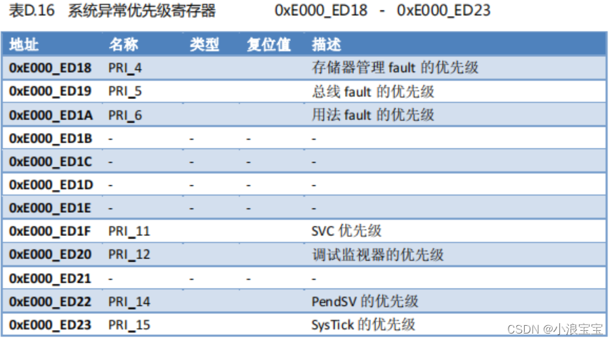 表中一个地址是8个位,一个寄存器是32位。如果想设置PendSV的优先级,则需要从SHPR3首地址偏移16位;如果想设置SysTick的优先级,则SHPR3首地址偏移24位。