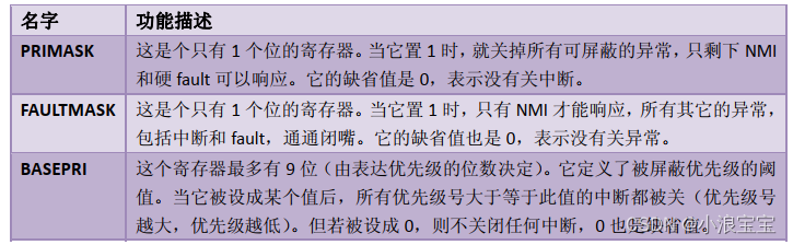 三个中断屏蔽寄存器,分别为 PRIMASK、 FAULTMASK 和BASEPRI