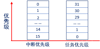 3、中断优先级数值越小越优先,任务优先级数值越大越优先