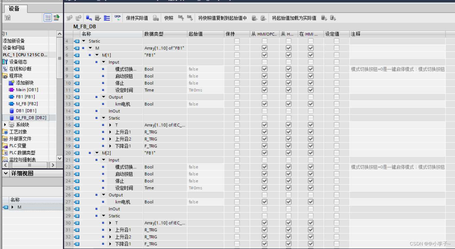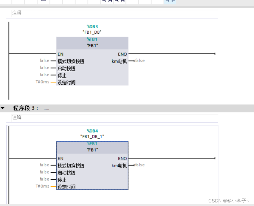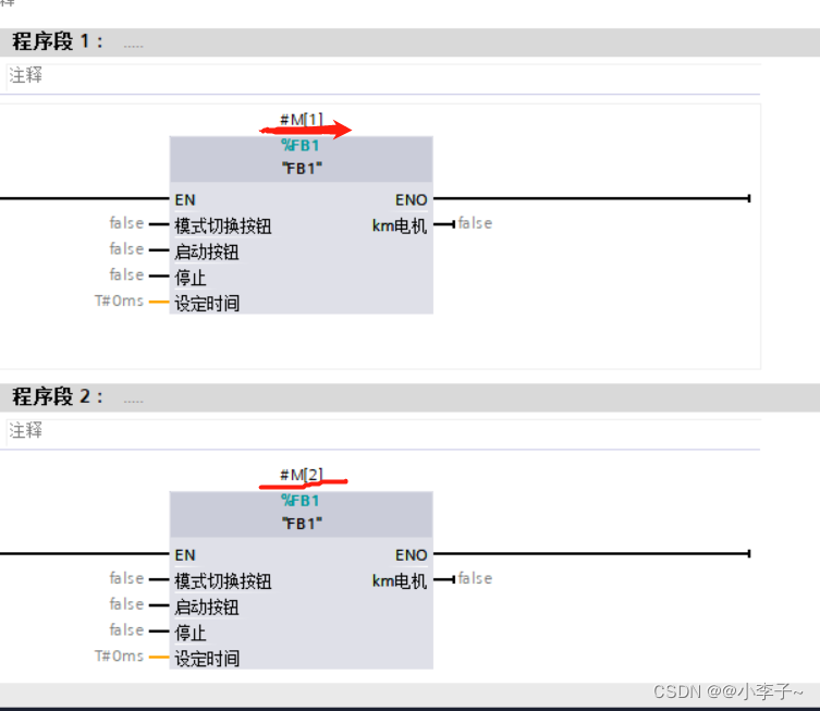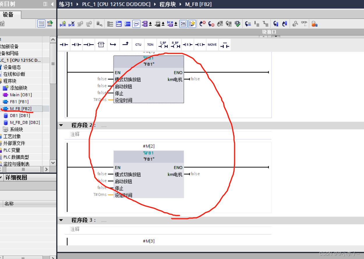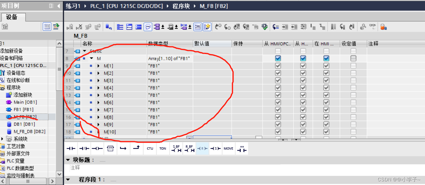 我们新建一个FB(M_FB)在里面调用多次FB1,最后在OB中调用1个M_FB函数块就可以了,这种比较节省空间。