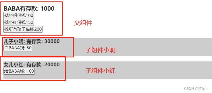 methods: {//找儿子借钱JieQianFromXM(money) {//父组件的数据累加100this.money += money;this.$refs.xm.money -= money;},//找女儿借钱JieQianFromXH(money) {//父组件的数据累加150this.money += money;this.$refs.xh.money -= money;},},打印组件标签ref打了标识。