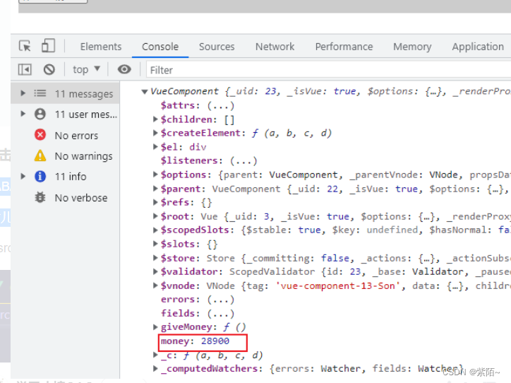 JieQianAll(money){this.money += 2*money;//组件实例自身拥有一个属性$children,可以获取到当前组件中,全部子组件this.$children.forEach(item=>item.money-=money);//不建议用数组下标获取子组件:因为没办法确定到底是那个子组件// this.$children[0].money -=money;},打印**$children**