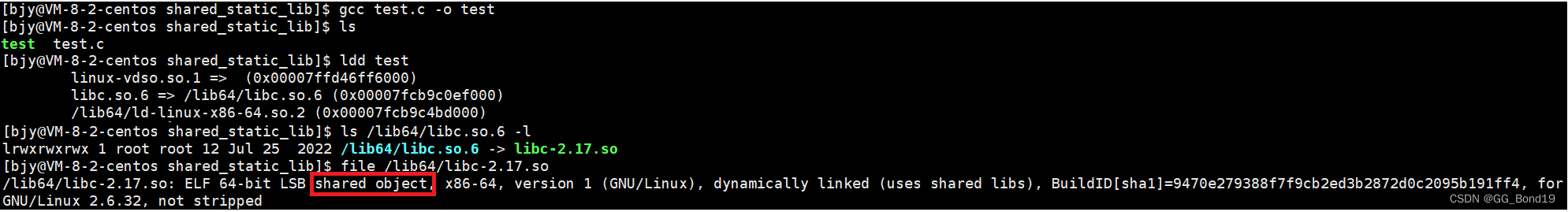 从上图可以看出test可执行程序依赖 /lib64/libc.so.6 ,但是其是一个软链接,链接的源文件为/lib64/libc-2.17.so。这个 libc-2.17.so 实际上就是C动态库,去掉一个库前缀lib,再去掉后缀,剩下的就是库的名字。