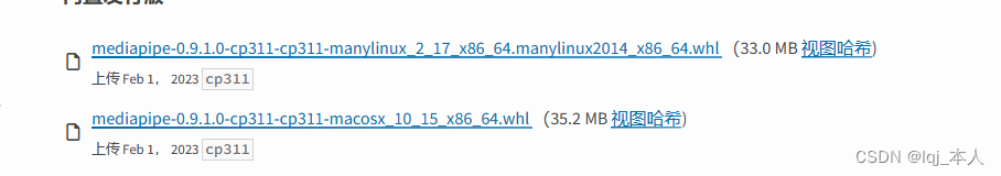 2.查看自己安装的python版本与mediapipe是否对应,选择对应自己的python版本的mediapipe版本进行手动下载:
