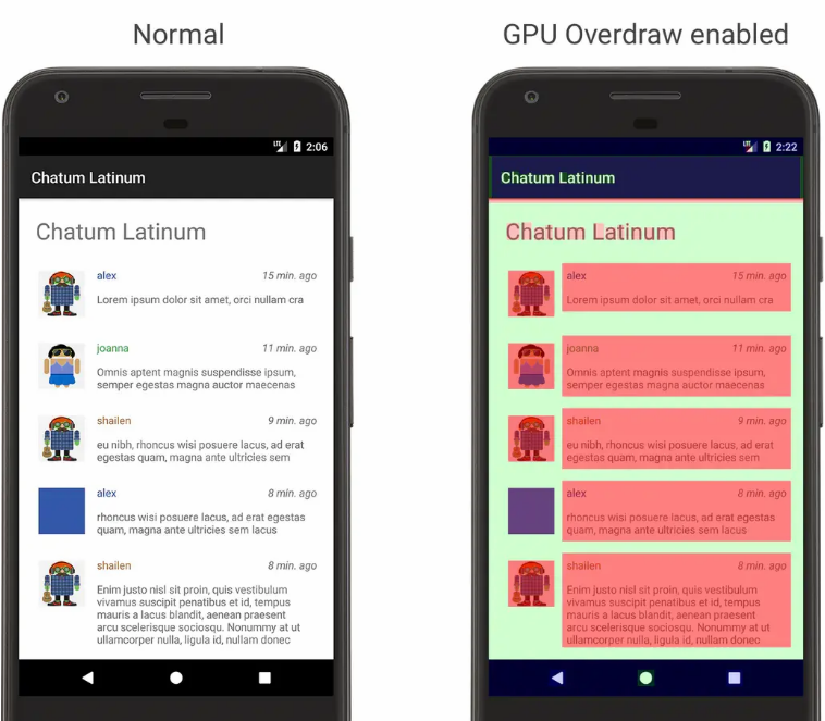 过度绘制是同一个像素点上被多次绘制,减少过度绘制一般减少布局背景叠加等方式,如下图所示右边是过度绘制的图片。